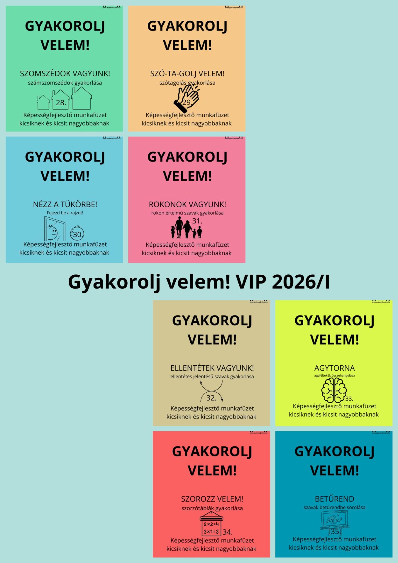8 db 15 feladatot tartalmazó Gyakorolj velem! képességfejlesztő munkafüzet, ami online letölthető PDF dokumentum. A feladatsorok az óvodás / az általános iskola 1-4. évfolyamos tanulóknak nyújt gyakorlási lehetőséget.